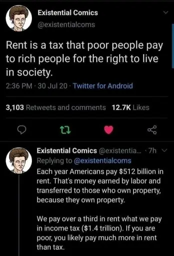 I’m sorry but I myself bought my first property and I’m looking forward to buy a second one (a studio) as we plan to have children, that studio will be rented out for 10+ years. Bought paid with cash from my own business after working my ass in factories for many years. Property on which I’m paying taxes nonetheless and I’m paying taxes on the rent that I will charge as well. Where’s the theft on my part in this situation? The fact that I managed to earn some money and locked it in a property for my future generations? The fuck.