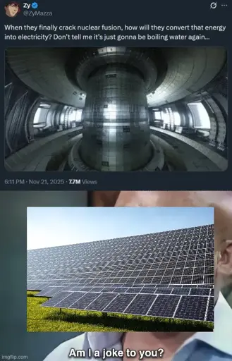 arrow-up11.03Karrow-down1imageIf God had wanted us to have nearly unlimited clean energy, He would have placed a fusion reactor into the sky.feddit.orgmxeff@feddit.org to Science Memes@mander.xyzEnglish · 14 days agomessage-square189linkfedilink