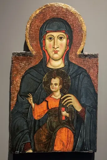 This painting by an unknown artist active in Tuscany is today only a fragment of its original format. In its entirety, the Virgin Mary was depicted full-length and seated on a throne as the Queen of Heaven. She holds Christ in her arms, as he makes a blessing gesture with his right hand and holds a scroll in his left. The iconography and the very frontal, formal style derive from the traditions of Byzantine art.