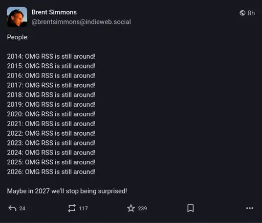 I like Brent’s stuff. If you’re on the Apple side of things, his NetNewsWire RSS reader is great (and open source!). I use it with a self-hosted FreshRSS backend and it works great.