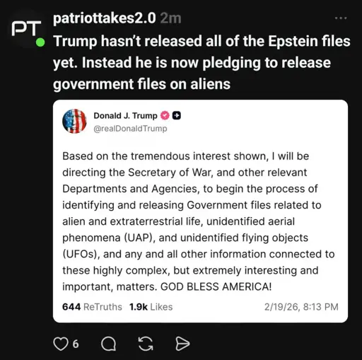 If you told me when I was a kid that the president of the US was going to drop info on aliens and no one would care … I would have said you were insane. Really, I dont care … lets see those Epstein files and get some arrests.