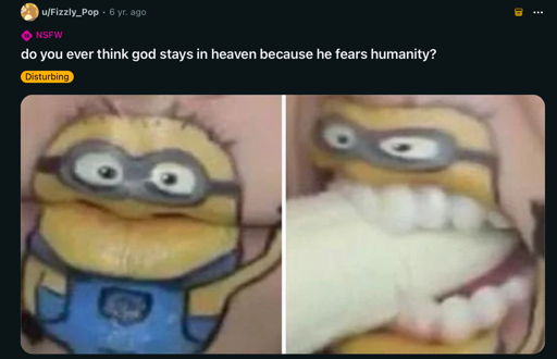 1·1 day agoI don’t care if there’s a thousand butt ass naked green aliens roaming around in Area 51, I’d rather see the pedophile elites face the consequences.