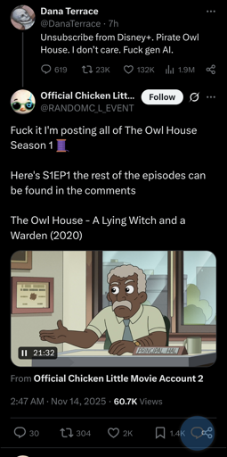 Piracy: ꜱᴀɪʟ ᴛʜᴇ ʜɪɢʜ ꜱᴇᴀꜱ@lemmy.dbzer0.com•'The Owl House’ creator Dana Terrace situation with Disney+ positive views on AI generated contentEnglish